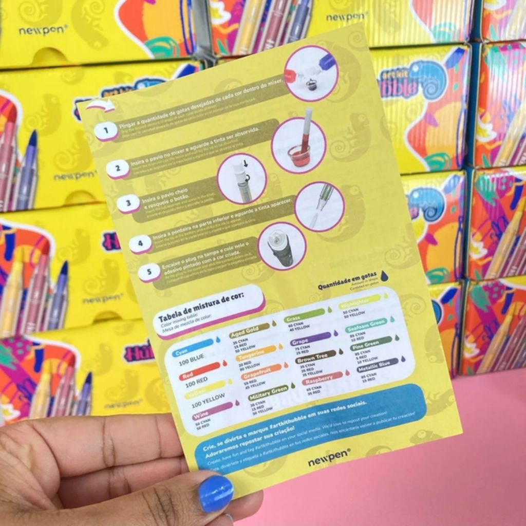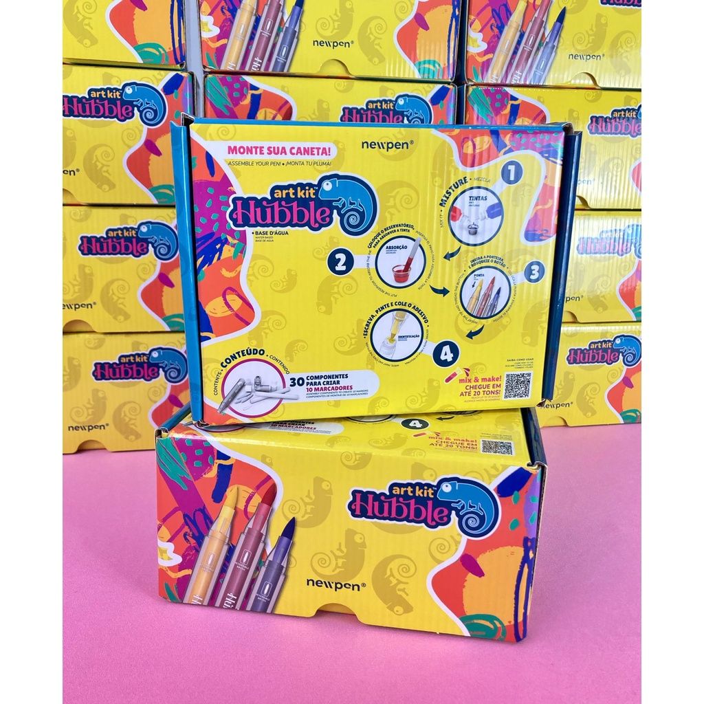 Com o Art Kit Hubble você pode soltar a sua imaginação e criar até 10 canetas por kit com, no mínimo, 20 opções de cores diferentes. Além disso, o kit também acompanha um manual de instruções junto à sugestões de como fazer algumas cores.