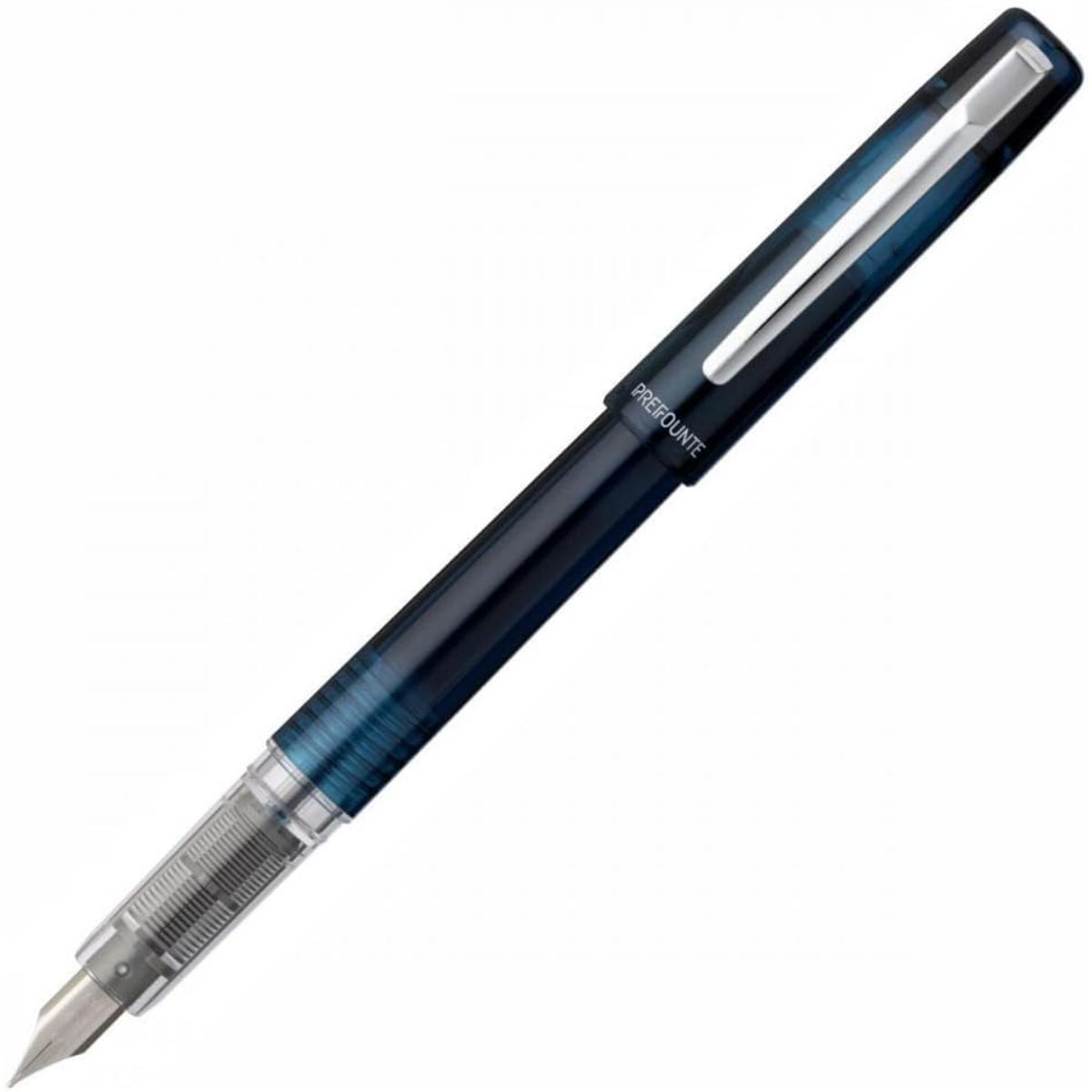 A Caneta Tinteiro Platinum Prefounte 0,5 na sofisticada cor Night Sea é um exemplo de design minimalista com um toque de requinte. O corpo transparente em resina revela uma tonalidade azul escuro, evocando a profundidade e a tranquilidade do oceano à noite. A tampa translúcida e o clipe de bolso de metal completam o visual elegante e moderno da caneta.