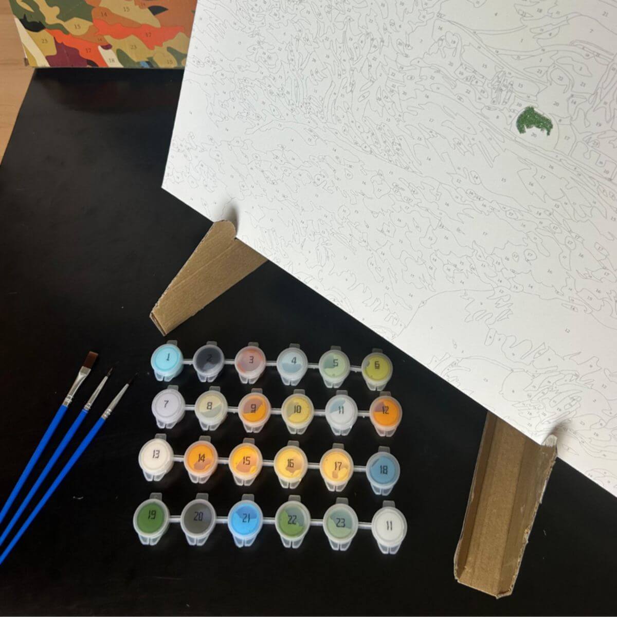 A embalagem pode ser transformada em um cavalete prático, tornando o processo de pintura mais organizado e confortável.