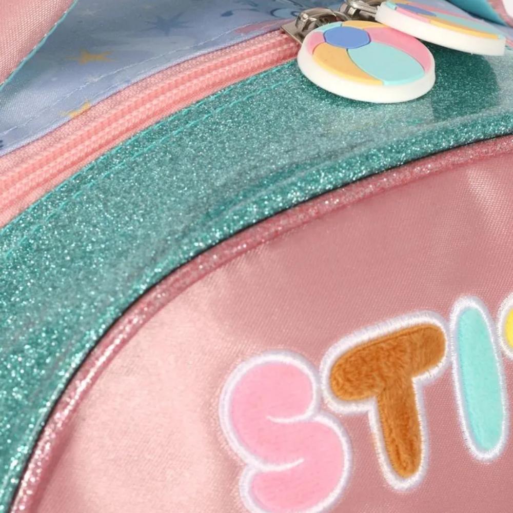 - Design Atrativo: A frente em PVC brilhante exibe uma estampa exclusiva do Stitch e um logotipo em material atoalhado, conferindo textura e apelo visual.